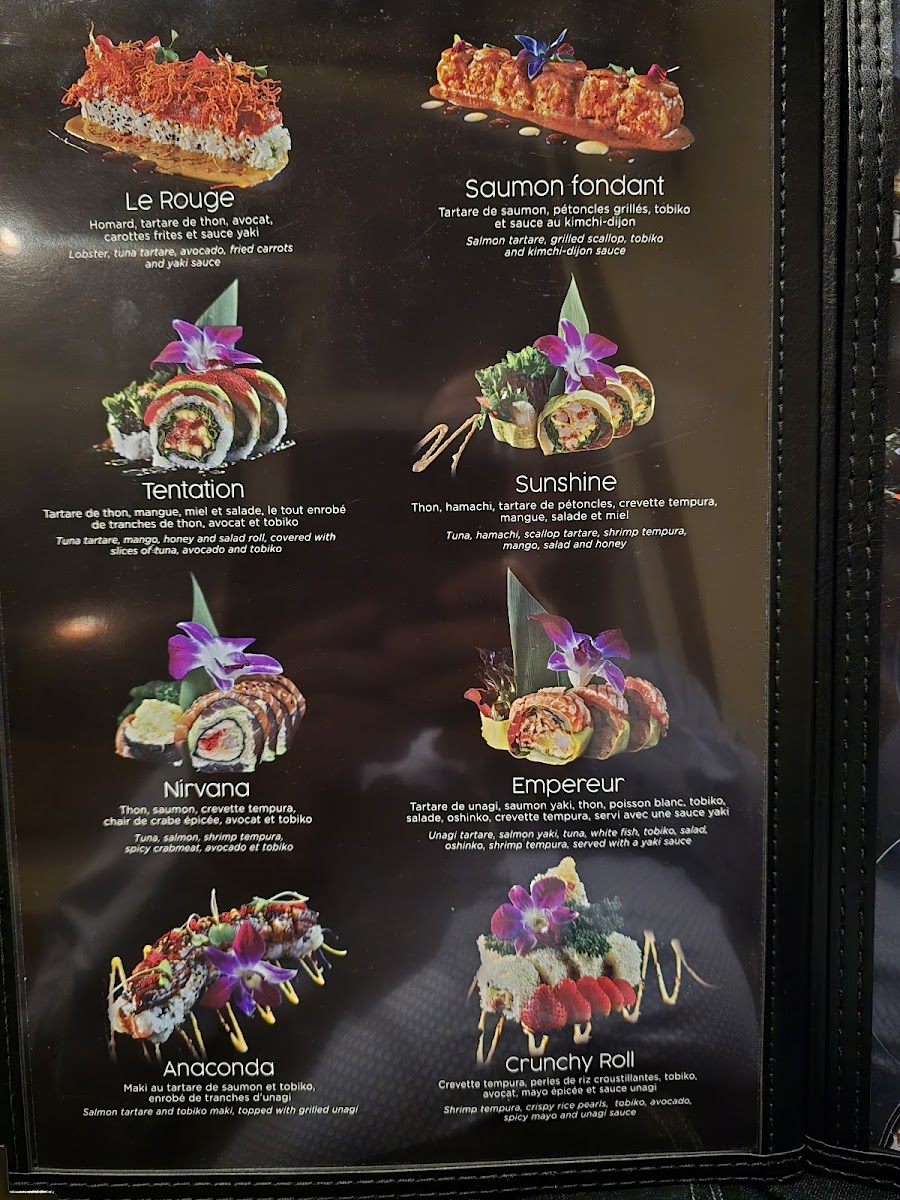 Crabe, petoncle, crevette tempura, saumon, tobiko, masago, tempura, concombre, sauce epicee. / Crab meat, scallop, shrimp tempura, salmon, tobiko, masago, tempura, cucumber, spicy sauce.