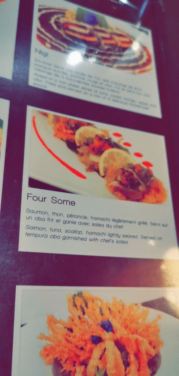 Petoncle, tobiko, tempura, sauce epicee. / Scallops, tobiko, tempura, spicy sauce. ( sashimi 1 mcx )