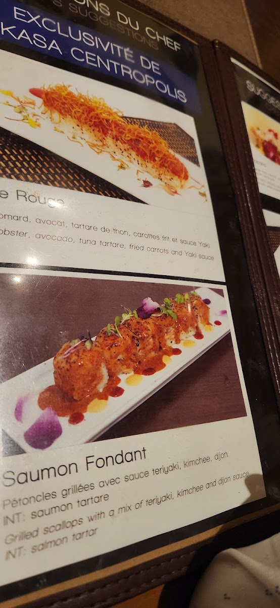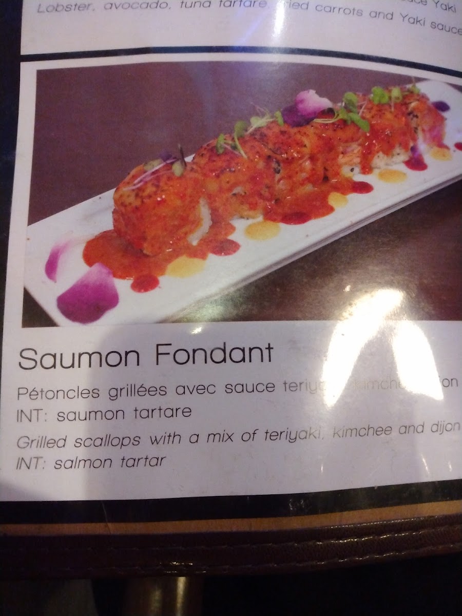 Chair d'homard, tobiko, tempura, sauce epicee Lorster meat , tobiko, tempura, spicy sauce. ( sashimi 1 mcx )